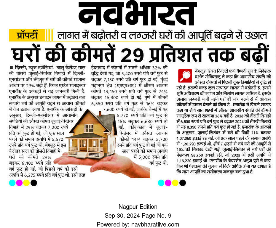 According to a report by Anarock Property Consultants, housing prices across major Indian cities have witnessed a sharp rise of up to 29% in the July–September 2024 quarter compared to last year.