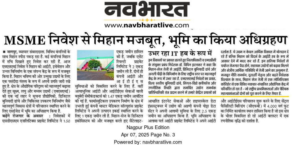 MIHAN-SEZ (Multi-modal International Cargo Hub and Airport at Nagpur – Special Economic Zone) is receiving a major boost from new investments across diverse sectors, specifically IT, ITES, Data Centers, and Pharmaceutical manufacturing. This flow of MSME (Micro, Small, and Medium Enterprises) investment is strengthening MIHAN’s position as a developing IT hub for the Vidarbha region.