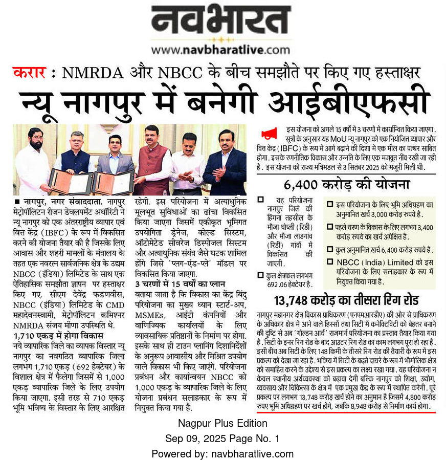 The Maharashtra government, through the Nagpur Metropolitan Region Development Authority (NMRDA), has partnered with the Central PSU NBCC (India) Limited and secured funding from HUDCO to develop ‘Naveen Nagpur’ (New Nagpur). This project aims to establish a world-class International Business and Finance Centre (IBFC), similar to Mumbai’s BKC or Gujarat’s GIFT City, to transform Nagpur into a major global commercial and financial hub.
