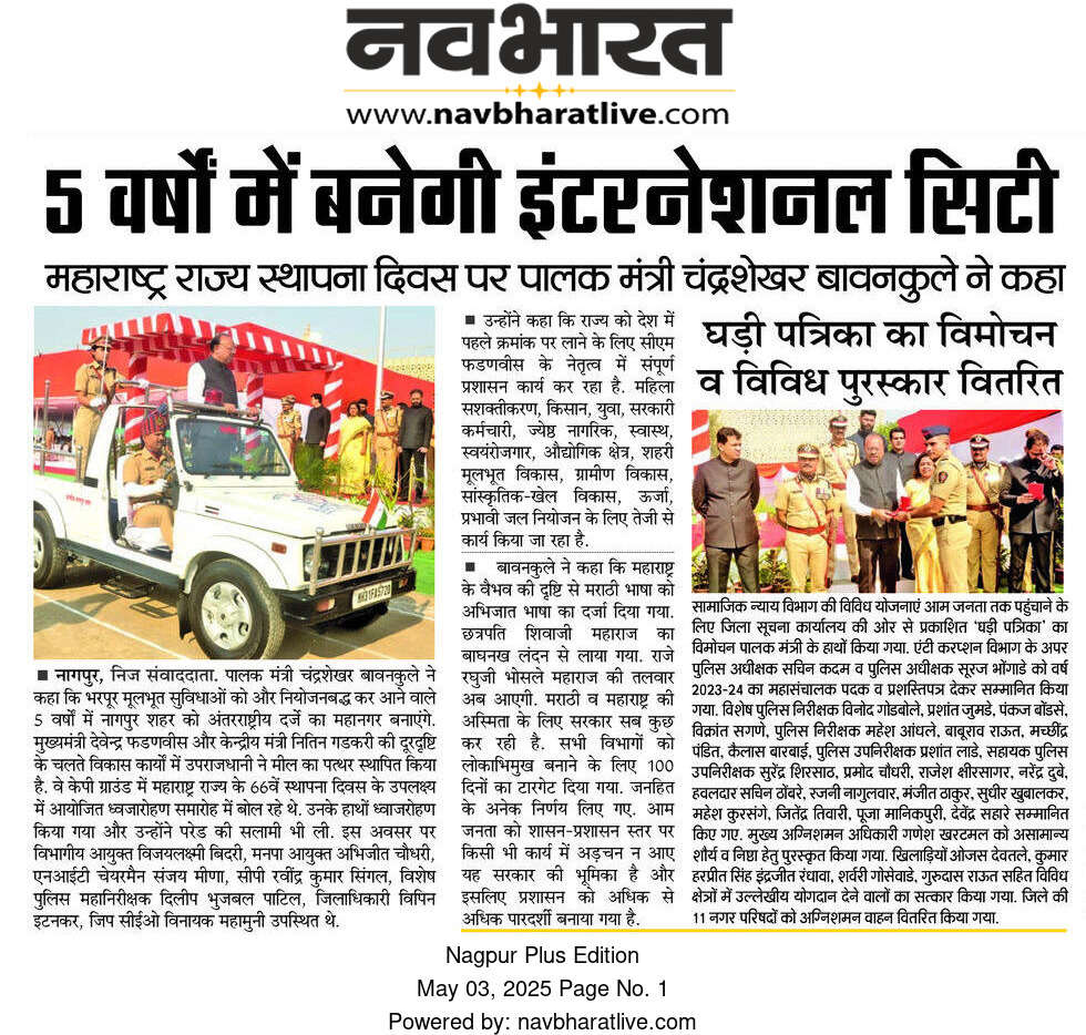On the occasion of Maharashtra State Formation Day, Guardian Minister Chandrashekhar Bawankule announced that Nagpur is set to transform into an International City within the next five years.