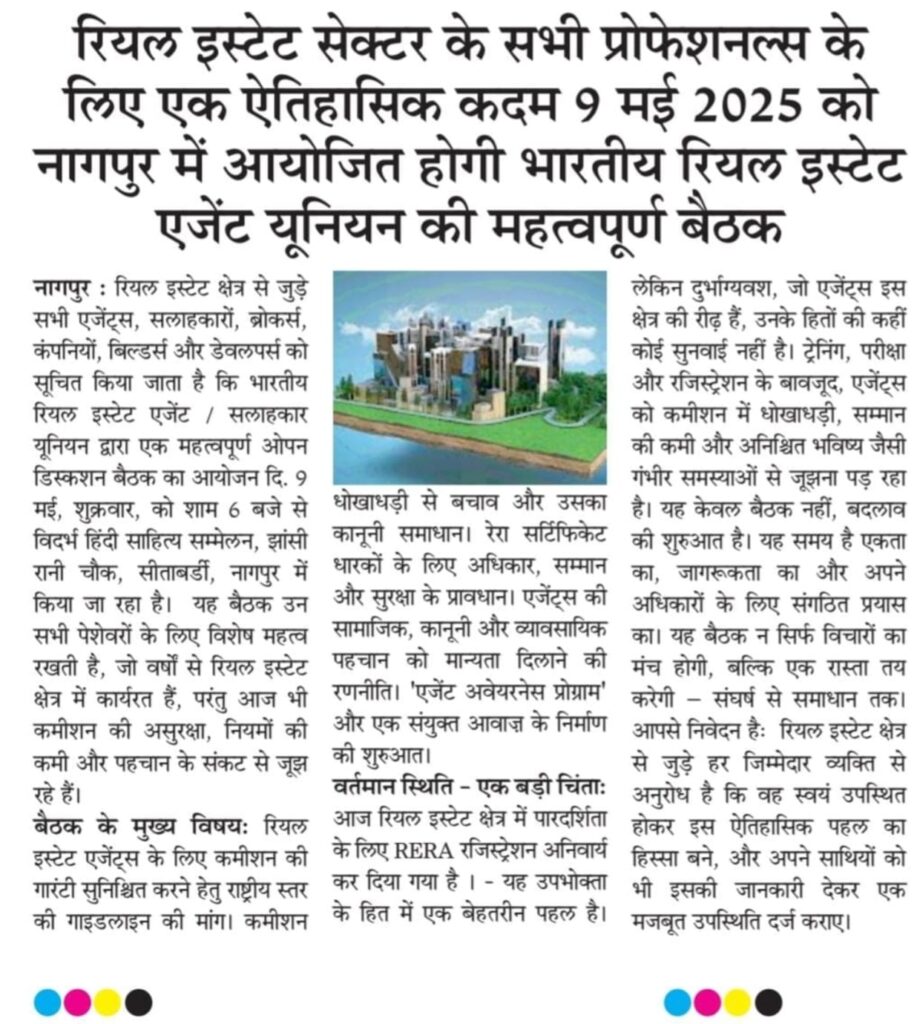 In a landmark move for the real estate sector, a major open discussion meeting is being organized by the Bhartiya Real Estate Agent & Consultant Union on 9th May 2025 at Vivek Hindi School, Sitabuldi, Nagpur. The event will begin at 6 PM and aims to bring together agents, consultants, brokers, builders, and developers under one roof.