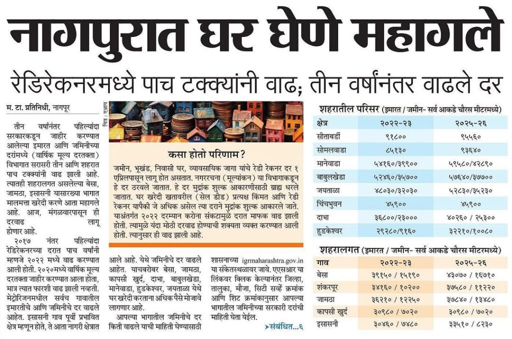 Homebuyers and property owners in Nagpur should note a major change in the real estate landscape: the Maharashtra government has significantly revised the Ready Reckoner (RR) Rates for the region after a gap of three years, making property transactions more expensive. This revision is effective from April 1, 2025.